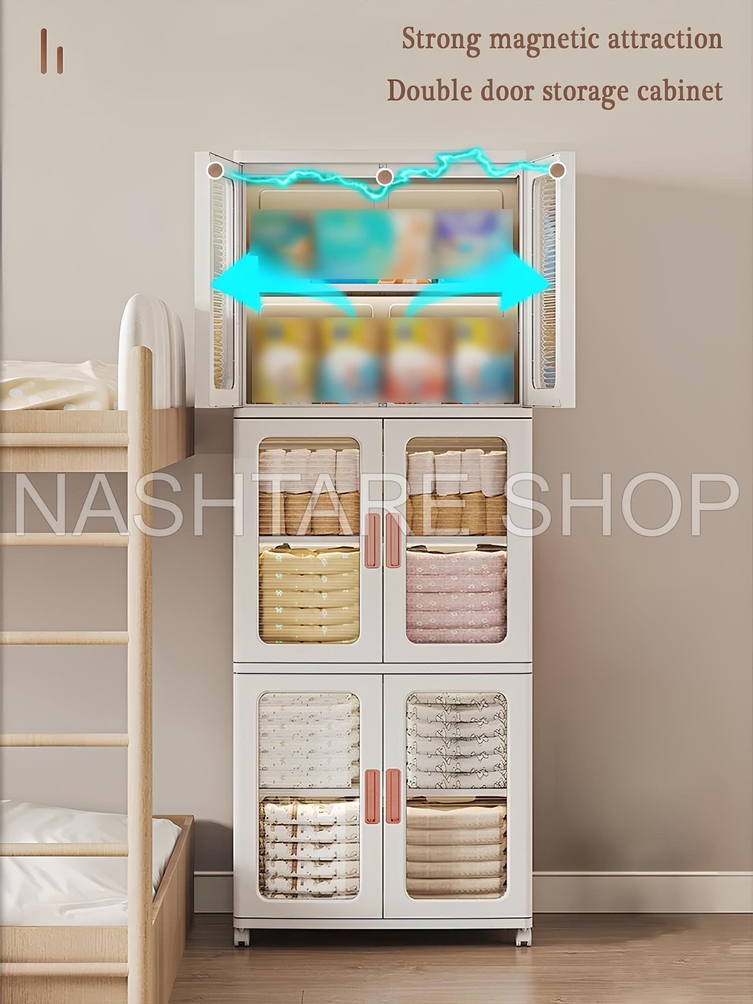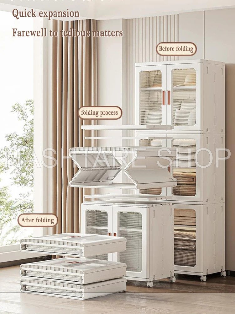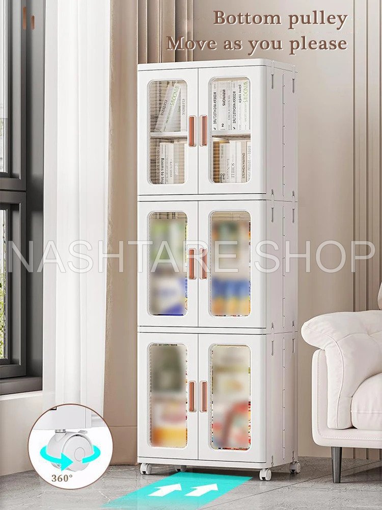 This modern, multi-purpose storage cabinet features a sleek design with transparent doors, ideal for organizing books, household items, or kitchenware. Designed with smooth-rolling wheels for easy mobility and a compact build to fit seamlessly in any room.