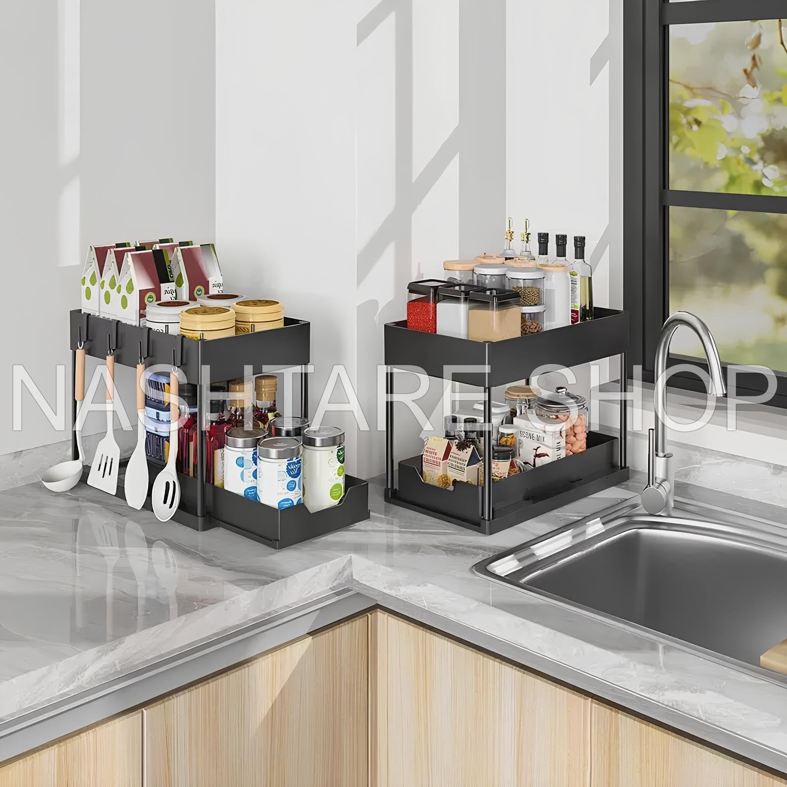 Storage Rack Double Layer Pull-out Style Large Capacity Hollow Draining with 4 Hooks Sliding Drawer Cabinet Basket Organizer Kitchen Accessories