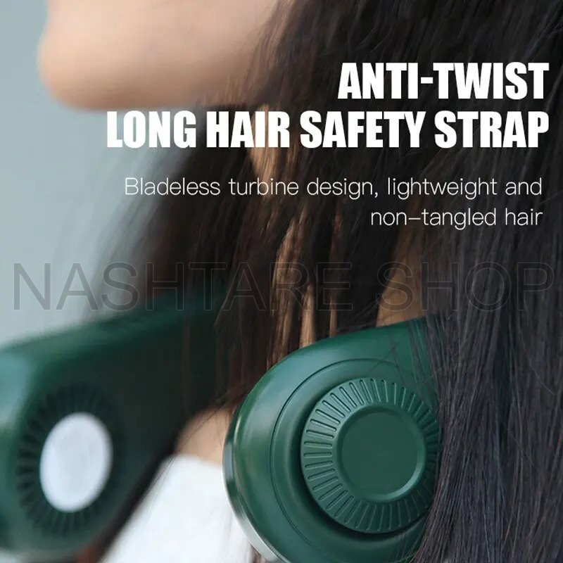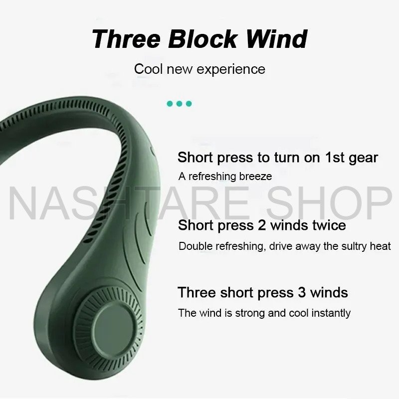 - Rechargeable hanging neck fan designed for hands-free cooling