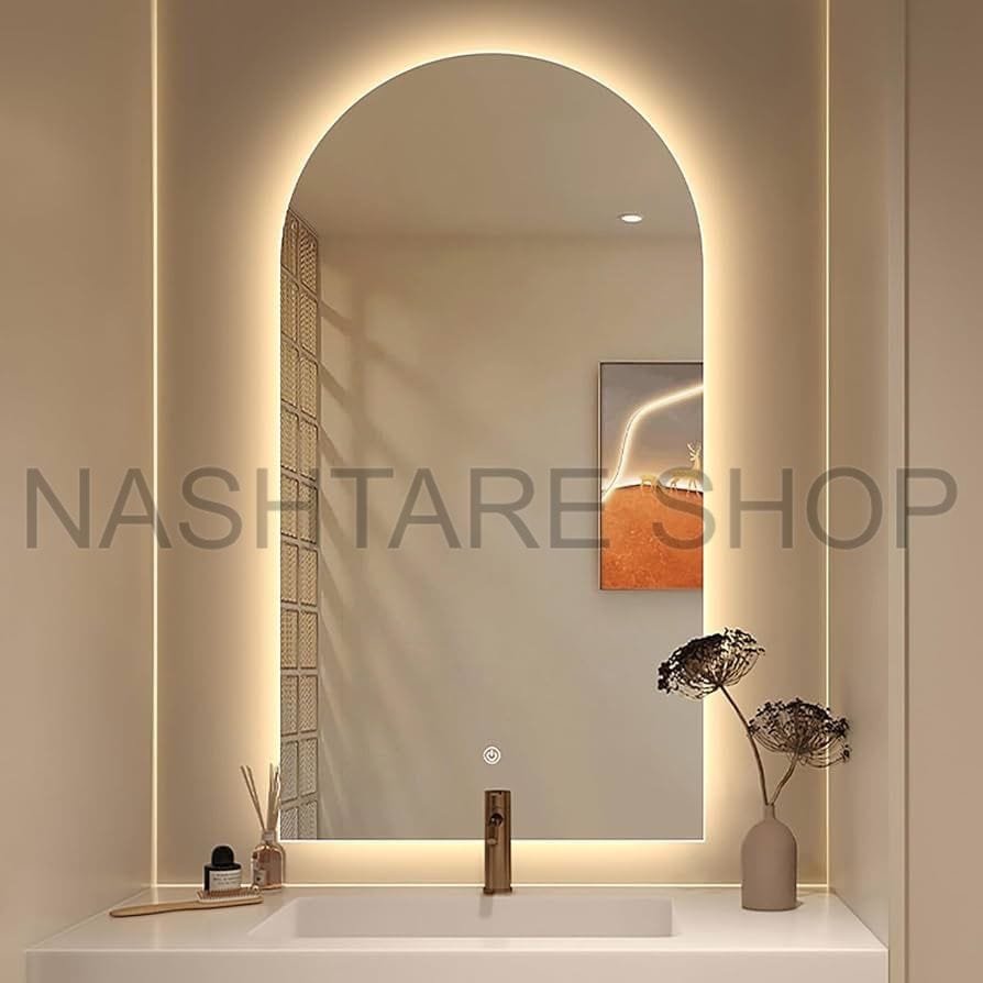 A modern half-circle, half-rectangle mirror featuring LED backlighting. Available in white and warm light, this stylish mirror is perfect for bedrooms, bathrooms, or dressing areas, providing both functional illumination and decorative appeal.